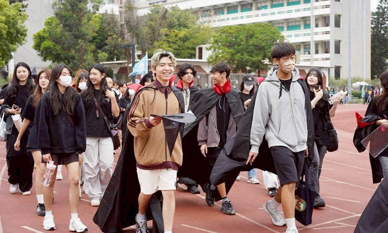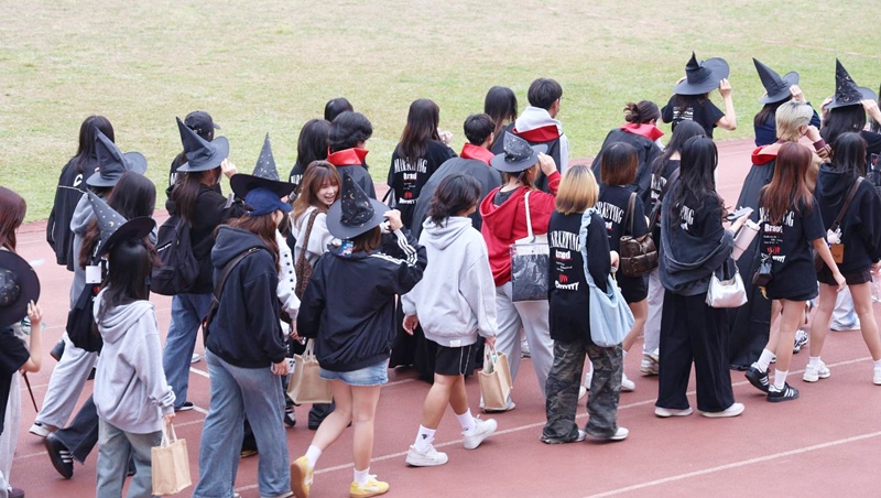 由於隊伍僅能在主席台前短暫停留,學生須於有限時間內完整展現主題精神與創意巧思,極具挑戰性。行銷系以 「AI 領航,行銷飛揚!」 作為繞場口號,展現結合科技趨勢與專業行銷實力的系所形象。在造型設計上,融合米奇白手套與哈利波特系列的魔法帽、披肩與魔法棒等元素,透過魔法意象象徵行銷人以創意與策略改變世界,整體視覺表現吸睛。